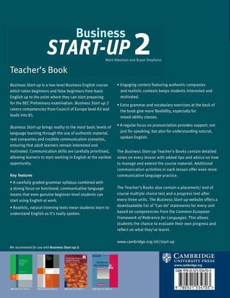 Business Start-up is a two-level (CEF level A1/A2) Business English course for adults who need English for their work. The Teacher's Book contains detailed notes on every lesson with added tips and advice on how to manage and extend the course material. Additional communication activities in each lesson offer even more communicative language practice. The Teacher's Book also contains a placement/end of course multiple choice test and progress tests after every three units. The Business Start-up website offers a downloadable list of Can-do statements for every unit based on competencies from the Common European Framework of Reference for Languages, allowing students the chance to reflect on what they've learnt and evaluate their own progress.