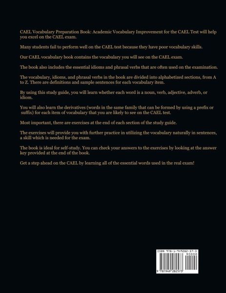 CAEL Vocabulary Preparation Book: Academic Vocabulary Improvement for the CAEL Test will help you excel on the CAEL exam. Many students fail to perform well on the CAEL test because they have poor vocabulary skills. Our CAEL vocabulary book contains the vocabulary you will see on the CAEL exam. The book also includes the essential idioms and phrasal verbs that are often used on the examination. The vocabulary, idioms, and phrasal verbs in the book are divided into alphabetized sections, from A to Z. There are definitions and sample sentences for each vocabulary item. By using this study guide, you will learn whether each word is a noun, verb, adjective, adverb, or idiom. You will also learn the derivatives (words in the same family that can be formed by using a prefix or suffix) for each item of vocabulary that you are likely to see on the CAEL test. Most important, there are exercises at the end of each section of the study guide. The exercises will provide you with further practice in utilizing the vocabulary naturally in sentences, a skill which is needed for the exam. The book is ideal for self-study. You can check your answers to the exercises by looking at the answer key provided at the end of the book. Get a step ahead on the CAEL by learning all of the essential words used in the real exam!