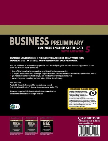 Cambridge English: Business Preliminary 5 provides four complete past papers for the Cambridge English: Business Preliminary exam (also known as BEC Preliminary). These examination papers from University of Cambridge ESOL Examinations (Cambridge ESOL) provide the most authentic exam preparation available, allowing candidates to familiarise themselves with the content and format of the examination and to practise examination techniques. It also contains a comprehensive section of keys and transcripts, making it suitable for self-study. Audio CDs containing the audio material for the Listening paper and a Self-study Pack (Student's Book with Answers and Audio CDs) are also available separately.