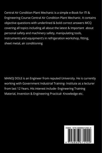 Central Air Condition Plant Mechanic is a simple e-Book for ITI & Engineering Course Central Air Condition Plant Mechanic. It contains objective questions with underlined & bold correct answers MCQ covering all topics including all about the latest & Important about personal safety and machinery safety, manipulating tools, instruments and equipment’s in refrigeration workshop, fitting, sheet metal, air conditioning equipment’s, Split A.C (wall mounted), Split A.C (floor, ceiling /cassette mounted Split A.C), Split A.C (ducted), multi Split A.C and Inverter Split A.C., water cooler & water dispenser, visible cooler, bottle cooler, deep freezer, Ice candy plant, Ice plant, walk in cooler, Leak testing, evacuation, gas charging, Commissioning and trouble shooting of package A.C with air and water cooled condenser fire dampers, Checking airflow, damper, temperature and pressure, operation, De-scaling condenser and cooling tower of central AC plant (Direct and Indirect).and lots more.