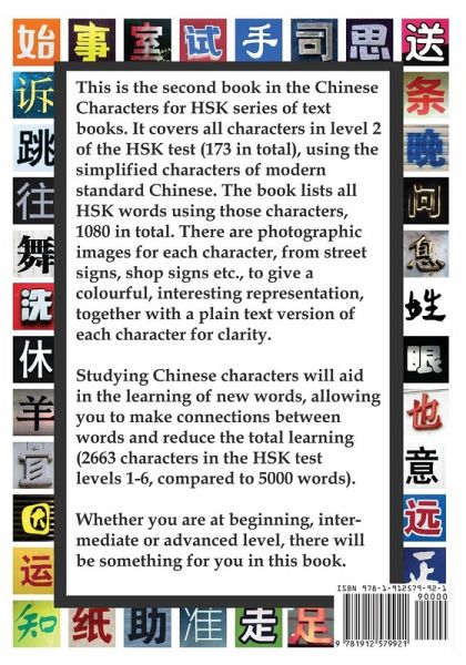The second book in the Chinese Characters for HSK series of text books covers all new characters in level 2 of the HSK test (173 in total), using the simplified characters of modern standard Chinese. The book lists all HSK words which use those characters, up to level 6, totalling 1080 words, including all 150 words in level 2. There are photographic images for each character, from street signs, shop signs etc., to give a colourful, interesting representation, together with a plain text version of each character for clarity. Studying Chinese characters will aid in learning new words, allowing you to make connections between words and reduce the total learning (2663 characters in the HSK test levels 1-6, compared to 5000 words). Whether you are at beginning, intermediate or advanced level, there will be something for you in this book.