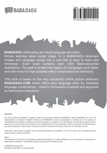BABADADA dictionaries are visual language education: Simple learning takes center stage. In a BABADADA dictionary images and language merge into a unit that is easy to learn and remember. Each book contains over 1000 black-and-white illustrations. The goal is to learn the basics of a language much faster and with more fun than possible with a complicated text dictionary. This book is based on the very successful online picture dictionary BABADADA.COM, which offers easy language entry for countless language combinations - Used by thousands of people and approved by well-known institutions. The languages used in this book are also called as follows: Chinesisch, chinois, chino, Cinese, chinês, chi¿ski