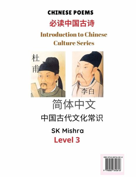 Learning Mandarin Chinese language is a lot about learning the ancient Chinese culture. The Chinese poems are part and parcel of the Chinese culture. The classic poems offer a unique opportunity not only to understand the ancient culture, but also an interesting way to learn very important Mandarin phrases and idioms. These poems, passed down from generation to generation, have tremendous cultural significance in China. The current book volume, Chinese Poems, is a Chinese reading practice book. It introduces 25 very famous and must know classic Chinese poems (¿¿¿¿¿¿). In addition, for each of the poems, a detailed explanation along with the corresponding poet's profile is also provided in the book. The featured 25 famous ancient poems are extremely popular in China and virtually every Chinese knows them well (¿¿¿¿¿¿25¿). This classic collection, that includes poems of Li Bai (¿¿), Du Fu (¿¿), Wang Wei (¿¿), etc., has a very high importance for the Chinese literary works. In fact, the words of these poems are deeply ingrained in the minds of Chinese people as they are enforced through repetition during the primary education. As such, in China, every child knows these 25 poems very well. The volume, 3rd in the "Introduction to Chinese Culture Series", includes both the Chinese text (simplified characters) and pinyin. With about 1000 unique Chinese characters, the volume would be suitable for the beginners, lower intermediate and advanced level Chinese language learners (HSK 1-6). Overall, the reading series offers you a variety of elementary level books (Level 1/2/3) to learn Chinese culture as well as practice Chinese reading fast.