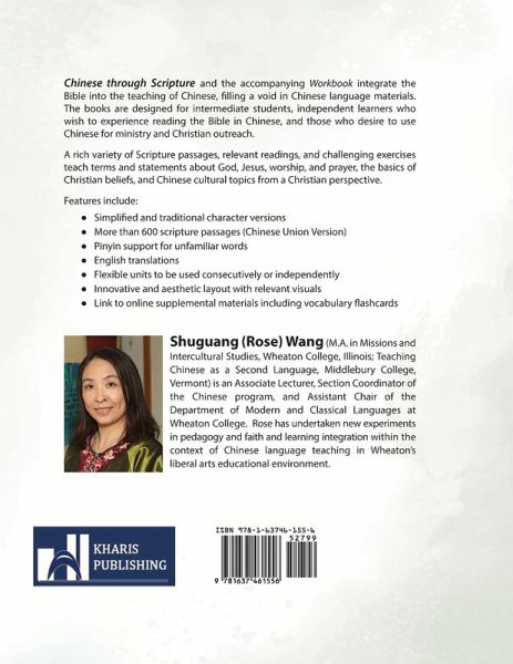 Chinese through Scripture and the accompanying Workbook integrate the Bible into the teaching of Chinese, filling a void in Chinese language materials. The books are designed for intermediate students, independent learners who wish to experience reading the Bible in Chinese, and those who desire to use Chinese for ministry and Christian outreach. A rich variety of Scripture passages, relevant readings, and challenging exercises teach terms and statements about God, Jesus, worship, and prayer, the basics of Christian beliefs, and Chinese cultural topics from a Christian perspective. Features include:Simplified and traditional character versions More than 600 scripture passages (Chinese Union Version) Pinyin support for unfamiliar words English translations Flexible units to be used consecutively or independently Innovative and aesthetic layout with relevant visuals Link to online supplemental materials including vocabulary flashcards About the Author: Shuguang (Rose) Wang (M.A. in Missions and Intercultural Studies, Wheaton College, Illinois; Teaching Chinese as a Second Language, Middlebury College, Vermont) is an Associate Lecturer, Section Coordinator of the Chinese program, and Assistant Chair of the Department of Modern and Classical Languages at Wheaton College. Rose has undertaken new experiments in pedagogy and faith and learning integration within the context of Chinese language teaching in Wheaton's liberal arts educational environment.