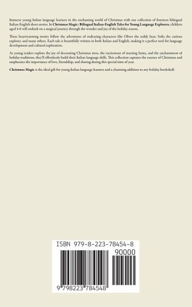 Immerse young Italian language learners in the enchanting world of Christmas with our collection of fourteen bilingual Italian-English short stories. In Christmas Magic: Bilingual Italian-English Tales for Young Language Explorers, children aged 4-6 will embark on a magical journey through the wonder and joy of the holiday season. These heartwarming stories follow the adventures of endearing characters like Oliver the teddy bear, Sofia the curious explorer, and many others. Each tale is beautifully written in both Italian and English, making it a perfect tool for language development and cultural exploration. As young readers explore the joy of decorating Christmas trees, the excitement of meeting Santa, and the enchantment of holiday traditions, they'll effortlessly build their Italian language skills. This collection captures the essence of Christmas and emphasizes the importance of love, friendship, and sharing during this special time of year. Christmas Magic is the ideal gift for young Italian language learners and a charming addition to any holiday bookshelf.
