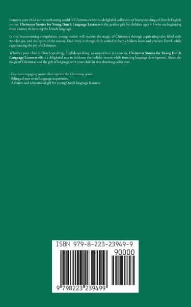 Immerse your child in the enchanting world of Christmas with this delightful collection of fourteen bilingual Dutch-English stories. Christmas Stories for Young Dutch Language Learners is the perfect gift for children ages 4-6 who are beginning their journey in learning the Dutch language. In this heartwarming compilation, young readers will explore the magic of Christmas through captivating tales filled with wonder, joy, and the spirit of the season. Each story is thoughtfully crafted to help children learn and practice Dutch while experiencing the joy of Christmas. Whether your child is Dutch-speaking, English-speaking, or somewhere in between, Christmas Stories for Young Dutch Language Learners offers a delightful way to celebrate the holiday season while fostering language development. Share the magic of Christmas and the gift of language with your child in this charming collection. - Fourteen engaging stories that capture the Christmas spirit. - Bilingual text to aid language acquisition. - A festive and educational gift for young Dutch language learners.