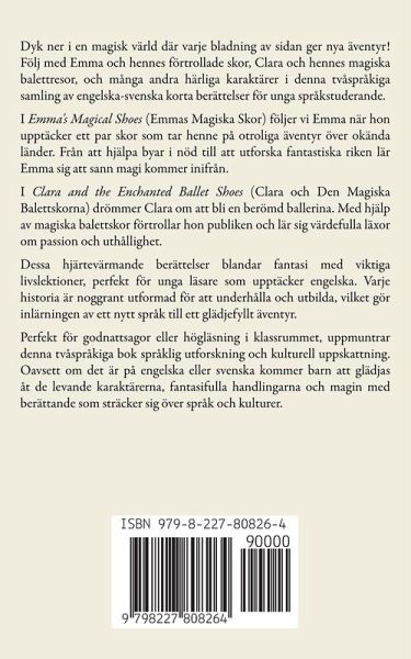 Dyk ner i en magisk värld där varje bladning av sidan ger nya äventyr! Följ med Emma och hennes förtrollade skor, Clara och hennes magiska balettresor, och många andra härliga karaktärer i denna tvåspråkiga samling av engelska-svenska korta berättelser för unga språkstuderande. I Emma's Magical Shoes (Emmas Magiska Skor) följer vi Emma när hon upptäcker ett par skor som tar henne på otroliga äventyr över okända länder. Från att hjälpa byar i nöd till att utforska fantastiska riken lär Emma sig att sann magi kommer inifrån. I Clara and the Enchanted Ballet Shoes (Clara och Den Magiska Balettskorna) drömmer Clara om att bli en berömd ballerina. Med hjälp av magiska balettskor förtrollar hon publiken och lär sig värdefulla läxor om passion och uthållighet. Dessa hjärtevärmande berättelser blandar fantasi med viktiga livslektioner, perfekt för unga läsare som upptäcker engelska. Varje historia är noggrant utformad för att underhålla och utbilda, vilket gör inlärningen av ett nytt språk till ett glädjefyllt äventyr. Perfekt för godnattsagor eller högläsning i klassrummet, uppmuntrar denna tvåspråkiga bok språklig utforskning och kulturell uppskattning. Oavsett om det är på engelska eller svenska kommer barn att glädjas åt de levande karaktärerna, fantasifulla handlingarna och magin med berättande som sträcker sig över språk och kulturer.