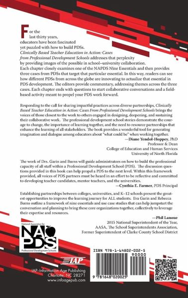 Teacher education in the United States is changing to meet new policy demands for centering clinical practice and developing robust school-university partnerships to better prepare high-quality teachers for tomorrow's schools. Professional development schools (PDSs) have recently been cited in national reports as exemplars of high-quality school-university partnerships in the clinical preparation of teachers. According to the National Association for Professional Development Schools, PDSs have Nine Essentials that distinguish them from other school-university collaborations. But even with that guidance, working across the boundaries of schools and universities remains messy, complex, and, quite frankly, hard. That's why, perhaps, there is such diversity in school-university partnerships. For the last thirty years, educators have been fascinated yet puzzled with how to build PDSs. Clinically Based Teacher Education in Action: Cases from PDSs addresses that perplexity by providing images of the possible in school-university collaboration. Each chapter closely examines one of the NAPDS Nine Essentials and then provides three cases from PDSs that target that particular essential. In this way, readers can see how different PDSs from across the globe are innovating to actualize that essential in PDS development. The editors provide commentary, addressing themes across the three cases. Each chapter ends with questions to start collaborative conversations and a field-based activity meant to propel your PDS work forward.