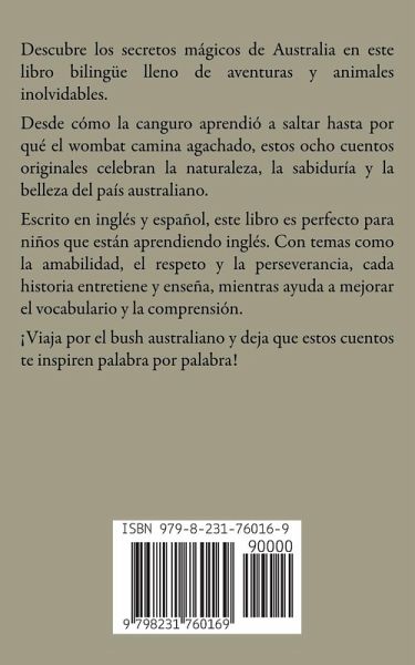 Descubre los secretos mágicos de Australia en este libro bilingüe lleno de aventuras y animales inolvidables. Desde cómo la canguro aprendió a saltar hasta por qué el wombat camina agachado, estos ocho cuentos originales celebran la naturaleza, la sabiduría y la belleza del país australiano. Escrito en inglés y español, este libro es perfecto para niños que están aprendiendo inglés. Con temas como la amabilidad, el respeto y la perseverancia, cada historia entretiene y enseña, mientras ayuda a mejorar el vocabulario y la comprensión. ¡Viaja por el bush australiano y deja que estos cuentos te inspiren palabra por palabra!