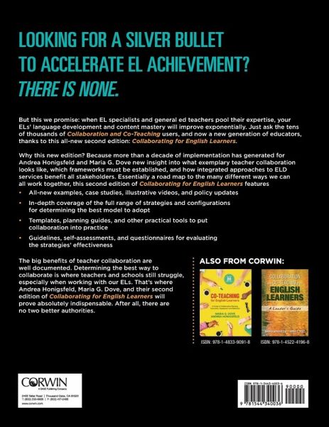 Looking for a silver bullet to accelerate EL achievement? There is none. But this, we promise: when EL specialists and general ed teachers pool their expertise, your ELs’ language development and content mastery will improve exponentially. Just ask the tens of thousands of Collaboration and Co-Teaching users and now, a new generation of educators, thanks to this all-new second edition: Collaborating for English Learners. Why this new edition? Because more than a decade of implementation has generated for Andrea Honigsfeld and Maria Dove new insight into what exemplary teacher collaboration looks like, which essential frameworks must be established, and how integrated approaches to ELD services benefit all stakeholders. Essentially a roadmap to the many different ways we can all work together, this second edition of Collaborating for English Learners features: All-new examples, case studies, illustrative video, and policy updates In-depth coverage of the full range of strategies and configurations for determining the best model to adopt Templates, planning guides, and other practical tools to put collaboration into practice Guidelines, self-assessments, and questionnaires for evaluating the strategies’ effectiveness By this time, the big benefits of teacher collaboration are well documented. Where teachers and schools struggle still is determining the best way to do so, especially when working with our ELs. That’s where Andrea Honigsfeld, Maria Dove, and their second edition of Collaborating for English Learners will prove absolutely indispensable. After all, there are no two better authorities.
