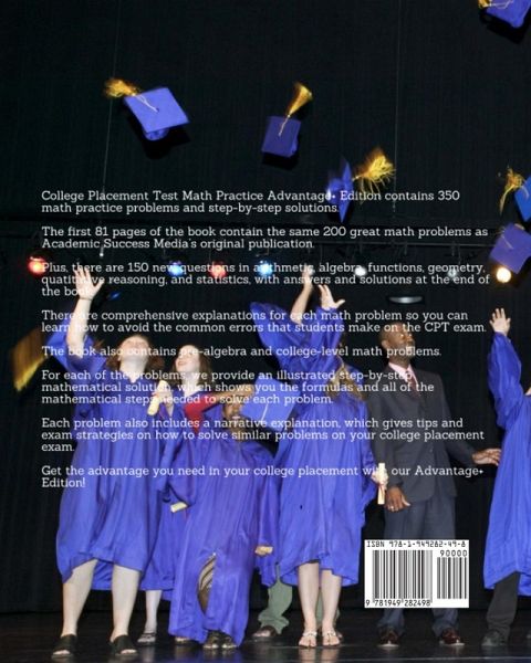 College Placement Test Math Practice Advantage+ Edition contains 350 math practice problems and step-by-step solutions. The first 81 pages of the book contain the same great 200 math problems as Academic Success Media's original publication. Plus, there are 150 new questions in algebra, functions, plane and coordinate geometry, and quantitative reasoning, with answers and solutions at the end of the book. There are comprehensive step-by-step explanations for each math problem so you can learn how to avoid the common errors that students make on the CPT exam. The publication covers the following topics: Arithmetic; Algebra and Functions, Plane and Coordinate Geometry, and Quantitative Reasoning and Statistics. The book also contains pre-algebra and college-level math problems. For each of the problems, we provide an illustrated step-by-step mathematical solution, which shows you the formulas and all of the mathematical steps needed to solve each problem. Each problem also includes a narrative explanation, which gives tips and exam strategies on how to solve similar problems on your college placement exam. You will also get the Advantage+ Edition Bonus Material: 40 arithmetic problems, 40 advanced algebra and geometry problems, 20 data analysis, statistics and probability questions, and 50 algebra and functions questions. Get the advantage you need in your college placement with our Advantage+ Edition!