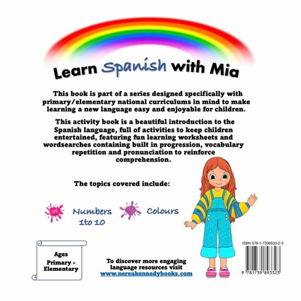 Colour, play and learn with Mia is part of a series of books designed specifically with primary - elementary national curriculums in mind to make learning a new language easy and enjoyable for children. A fun and relaxing way to encourage language learning one step at a time. This colouring book is a beautiful introduction to the Spanish language, Numbers 1 to 10 and Colours, containing built in progression, vocabulary repetition and pronunciation to reinforce comprehension. Age specifications: The book is aimed for children aged from 4 to 8 years old but it is suitable for any child (toddlers and nursery) who shows an interest in languages. Your child will love it! Watch with pride as your child grasps new skills and finds the confidence to use them. The topics covered include: Numbers 1 to 10 and Colours68 pages; Full of colouring activities, worksheets and wordsearches Beautiful & engaging illustrations Suitable for complete beginners in Spanish + bilingual upbringing