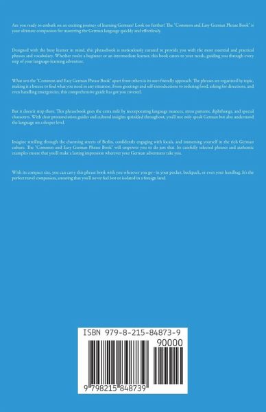 Are you ready to embark on an exciting journey of learning German? Look no further! The "Common and Easy German Phrase Book" is your ultimate companion for mastering the German language quickly and effortlessly. Designed with the busy learner in mind, this phrasebook is meticulously curated to provide you with the most essential and practical phrases and vocabulary. Whether you're a beginner or an intermediate learner, this book caters to your needs, guiding you through every step of your language-learning adventure. What sets the "Common and Easy German Phrase Book" apart from others is its user-friendly approach. The phrases are organized by topic, making it a breeze to find what you need in any situation. From greetings and self-introductions to ordering food, asking for directions, and even handling emergencies, this comprehensive guide has got you covered. But it doesn't stop there. This phrasebook goes the extra mile by incorporating language nuances, stress patterns, diphthongs, and special characters. With clear pronunciation guides and cultural insights sprinkled throughout, you'll not only speak German but also understand the language on a deeper level. Imagine strolling through the charming streets of Berlin, confidently engaging with locals, and immersing yourself in the rich German culture. The "Common and Easy German Phrase Book" will empower you to do just that. Its carefully selected phrases and authentic examples ensure that you'll make a lasting impression wherever your German adventures take you. With its compact size, you can carry this phrase book with you wherever you go - in your pocket, backpack, or even your handbag. It's the perfect travel companion, ensuring that you'll never feel lost or isolated in a foreign land.