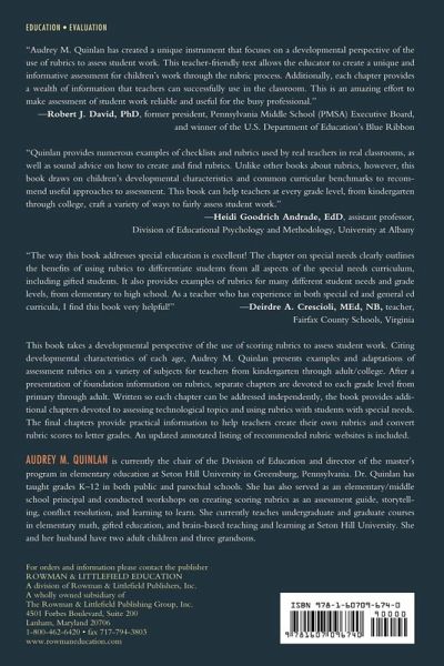 Audrey Quinlan has created a unique instrument that focuses on a developmental perspective of the use of rubrics to assess student work. This teacher-friendly text allows the educator to create a unique and informative assessment for children's work through the rubric process. Additionally, each chapter provides a wealth of information that teachers can successfully use in the classroom. This is an amazing effort to make assessment of student work reliable and useful for the busy professional.