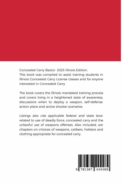 This book is designed to assist training students in Illinois Concealed Cary License classes and for anyone interested in the Concealed Carry topic. Contents include the Illinois mandated training topics, and also cover living in a heightened state of awareness, considerations involved with deadly force decisions, self-defense action plans and active shooter scenarios. Extensive listings also display federal and state laws applicable to concealed carry, digital apps with access to current state reciprocity maps and descriptions and covers the concept of "reasonableness"- the court standard citizens will be judged by following a self-defense situation. Practical topics include choice of popular pistols and revolvers, choice of calibers and ballistics myths, holsters and clothing suitable for successful concealed carry.
