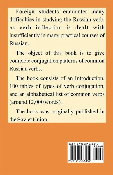 Foreign students encounter many difficulties in studying the Russian verb, as verb inflection is dealt with insufficiently in many practical courses of Russian. The object of this book is to give complete conjugation patterns of common Russian verbs. The book consists of an Introduction, 100 tables of types of verb conjugation, and an alphabetical list of common verbs (around 12,000 words). The book was originally published in the Soviet Union.
