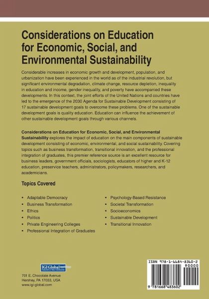 Considerable increases in economic growth and development, population, and urbanization have been experienced in the world as of the industrial revolution, but significant environmental degradation, climate change, resource depletion, inequality in education and income, gender inequality, and poverty have accompanied these developments. In this context, the joint efforts of the United Nations and countries have led to the emergence of the 2030 Agenda for Sustainable Development consisting of 17 sustainable development goals to overcome these problems. One of the sustainable development goals is quality education. Education can influence the achievement of other sustainable development goals through various channels. Considerations on Education for Economic, Social, and Environmental Sustainability explores the impact of education on the main components of sustainable development consisting of economic, environmental, and social sustainability. Covering topics such as business transformation, transitional innovation, and the professional integration of graduates, this premier reference source is an excellent resource for business leaders, government officials, sociologists, educators of higher and K-12 education, preservice teachers, administrators, policymakers, researchers, and academicians.
