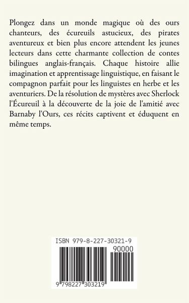 Plongez dans un monde magique où des ours chanteurs, des écureuils astucieux, des pirates aventureux et bien plus encore attendent les jeunes lecteurs dans cette charmante collection de contes bilingues anglais-français. Chaque histoire allie imagination et apprentissage linguistique, en faisant le compagnon parfait pour les linguistes en herbe et les aventuriers. De la résolution de mystères avec Sherlock l'Écureuil à la découverte de la joie de l'amitié avec Barnaby l'Ours, ces récits captivent et éduquent en même temps.