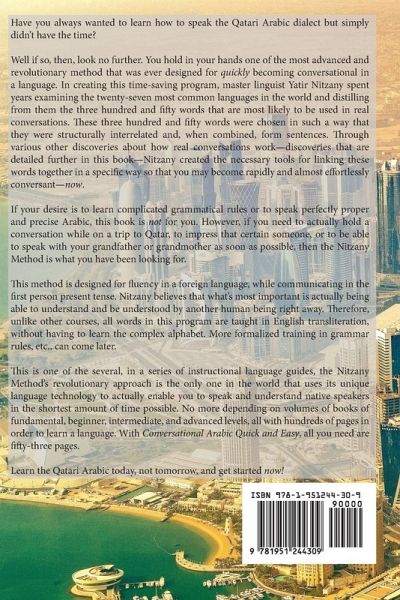 THIS BOOK DOESN'T CONTAIN ANY ARABIC LETTERS! ALL ARABIC WORDS IN THIS BOOK WERE WRITTEN IN ENGLISH-TRANSLITERATION! Have you always wanted to learn how to speak the Qatari Arabic Dialect but simply didn't have the time? Well if so, then, look no further. You can hold in your hands one of the most advanced and revolutionary method that was ever designed for quickly becoming conversational in a language. In creating this time-saving program, master linguist Yatir Nitzany spent years examining the twenty-seven most common languages in the world and distilling from them the three hundred and fifty words that are most likely to be used in real conversations. These three hundred and fifty words were chosen in such a way that they were structurally interrelated and, when combined, form sentences. Through various other discoveries about how real conversations work--discoveries that are detailed further in this book--Nitzany created the necessary tools for linking these words together in a specific way so that you may become rapidly and almost effortlessly conversant--now. If your desire is to learn complicated grammatical rules or to speak perfectly proper and precise Arabic, this book is not for you. However, if you need to actually hold a conversation while on a trip to Qatar, to impress that certain someone, or to be able to speak with your grandfather or grandmother as soon as possible, then the Nitzany Method is what you have been looking for. This book is recommended for those who already have some prior knowledge of the pronunciation of Arabic accents (such as the Arabic accents: ayin,ghayn, ha, and khaf). For those of you who do not, this book does indeed provide some great, in-depth techniques on the pronunciation and recognition of these accents, that you will encounter throughout the program. These techniques have proven extremely beneficial for beginner students who were previously unfamiliar with these accent pronunciations. But keep in mind this isn't a pronunciation book! This method is designed for fluency in a foreign language, while communicating in the first person present tense. Nitzany believes that what's most important is actually being able to understand and be understood by another human being right away. Therefore, unlike other courses, all words in this program are taught in English transliteration, without having to learn the complex alphabet. More formalized training in grammar rules, etc., can come later. This is one of the several, in a series of instructional language guides, the Nitzany Method's revolutionary approach is the only one in the world that uses its unique language technology to actually enable you to speak and understand native speakers in the shortest amount of time possible. No more depending on volumes of books of fundamental, beginner,intermediate, and advanced levels, all with hundreds of pages in order to learn a language. With Conversational Arabic Quick and Easy, all you need are forty-six pages. Learn Arabic today, get started now!