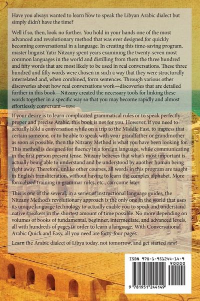 THIS BOOK DOESN'T CONTAIN ANY ARABIC LETTERS! ALL ARABIC WORDS IN THIS BOOK WERE WRITTEN IN ENGLISH-TRANSLITERATION! Have you always wanted to learn how to speak the Libyan Arabic dialect but simply didn’t have the time? Well if so, then, look no further. You can hold in your hands one of the most advanced and revolutionary method that was ever designed for quickly becoming conversational in a language. In creating this time-saving program, master linguist Yatir Nitzany spent years examining the twenty-seven most common languages in the world and distilling from them the three hundred and fifty words that are most likely to be used in real conversations. These three hundred and fifty words were chosen in such a way that they were structurally interrelated and, when combined, form sentences. Through various other discoveries about how real conversations work—discoveries that are detailed further in this book—Nitzany created the necessary tools for linking these words together in a specific way so that you may become rapidly and almost effortlessly conversant—now. If your desire is to learn complicated grammatical rules or to speak perfectly proper and precise Arabic, this book is not for you. However, if you need to actually hold a conversation while on a trip to the Middle East, to impress that certain someone, or to be able to speak with your grandfather or grandmother as soon as possible, then the Nitzany Method is what you have been looking for. This book is recommended for those who already have some prior knowledge of the pronunciation of Arabic accents (such as the Arabic accents: ayin, ghayn, ha, and khaf). For those of you who do not, this book does indeed provide some great, in-depth techniques on the pronunciation and recognition of these accents, that you will encounter throughout the program. These techniques have proven extremely beneficial for beginner students who were previously unfamiliar with these accent pronunciations. But keep in mind this isn’t a pronunciation book! Libyan Arabic encompasses several slightly different dialects, however, the one in this book is the Tripoli dialect. Keep in mind that Libyan Arabic is not an official language, but rather is a colloquial dialect. The purpose of my method is solely to give you the tools to create your own sentences in order to become conversational, while in regards to grammar, pronunciation, etc., you are on your own! This method is designed for fluency in a foreign language, while communicating in the first person present tense. Nitzany believes that what’s most important is actually being able to understand and be understood by another human being right away. Therefore, unlike other courses, all words in this program are taught in English transliteration, without having to learn the complex alphabet. More formalized training in grammar rules, etc., can come later. This is one of the several, in a series of instructional language guides, the Nitzany Method’s revolutionary approach is the only one in the world that uses its unique language technology to actually enable you to speak and understand native speakers in the shortest amount of time possible. No more depending on volumes of books of fundamental, beginner, intermediate, and advanced levels, all with hundreds of pages in order to learn a language. With Conversational Arabic Quick and Easy, all you need are forty-four pages. Learn the Arabic dialect of Libya today, not tomorrow, and get started now!