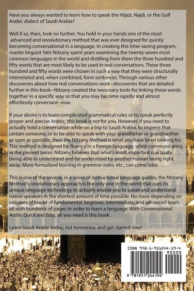 THIS BOOK DOESN'T CONTAIN ANY ARABIC LETTERS! ALL ARABIC WORDS IN THIS BOOK WERE WRITTEN IN ENGLISH-TRANSLITERATION! Have you always wanted to learn how to speak the Hijazi, Najdi, or the Gulf Arabic dialect of Saudi Arabia? Well if so, then, look no further. You can hold in your hands one of the most advanced and revolutionary method that was ever designed for quickly becoming conversational in a language. In creating this time-saving program, master linguist Yatir Nitzany spent years examining the twenty-seven most common languages in the world and distilling from them the three hundred and fifty words that are most likely to be used in real conversations. These three hundred and fifty words were chosen in such a way that they were structurally interrelated and, when combined, form sentences. Through various other discoveries about how real conversations work--discoveries that are detailed further in this book--Nitzany created the necessary tools for linking these words together in a specific way so that you may become rapidly and almost effortlessly conversant--now. If your desire is to learn complicated grammatical rules or to speak perfectly proper and precise Arabic, this book is not for you. However, if you need to actually hold a conversation while on a trip to Saudi Arabia, to impress that certain someone, or to be able to speak with your grandfather or grandmother as soon as possible, then the Nitzany Method is what you have been looking for. This method is designed for fluency in a foreign language, while communicating in the present tense. Nitzany believes that what's most important is actually being able to understand and be understood by another human being right away. More formalized training in grammar rules, etc., can come later. This is one of the several, in a series of instructional language guides, the Nitzany Method's revolutionary approach is the only one in the world that uses its unique language technology to actually enable you to speak and understand native speakers in the shortest amount of time possible. No more depending on volumes of books of fundamental, beginner, intermediate, and advanced levels, all with hundreds of pages in order to learn a language. With Conversational Arabic Quick and Easy, all you need is this book. Learn Saudi Arabic today, not tomorrow, and get started now!