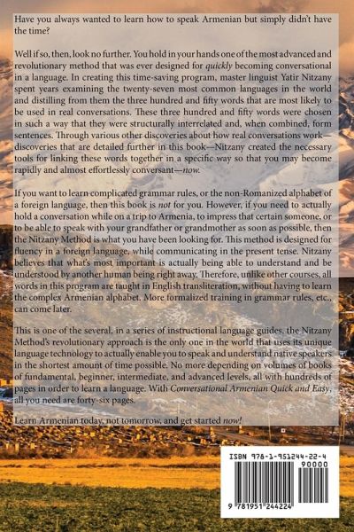 THIS BOOK DOESN'T CONTAIN ANY WORDS IN THE ARMENIAN ALPHABET! ALL ARMENIAN WORDS, IN BOTH THE KINDLE AND PAPERBACK VERSION OF THIS BOOK, WERE WRITTEN IN ENGLISH-TRANSLITERATION! Have you always wanted to learn how to speak Eastern Armenian but simply didn't have the time? Well if so, then, look no further. You can hold in your hands one of the most advanced and revolutionary method that was ever designed for quickly becoming conversational in a language. In creating this time-saving program, master linguist Yatir Nitzany spent years examining the twenty-seven most common languages in the world and distilling from them the three hundred and fifty words that are most likely to be used in real conversations. These three hundred and fifty words were chosen in such a way that they were structurally interrelated and, when combined, form sentences. Through various other discoveries about how real conversations work--discoveries that are detailed further in this book--Nitzany created the necessary tools for linking these words together in a specific way so that you may become rapidly and almost effortlessly conversant--now. If you want to learn complicated grammar rules, or the non-Romanized alphabet of a foreign language, then this book is not for you. However, if you need to actually hold a conversation while on a trip to Armenia, to impress that certain someone, or to be able to speak with your grandfather or grandmother as soon as possible, then the Nitzany Method is what you have been looking for. This method is designed for fluency in a foreign language, while communicating in the present tense. Nitzany believes that what's most important is actually being able to understand and be understood by another human being right away. Therefore, unlike other courses, all words in this program are taught in English transliteration, without having to learn the complex Armenian alphabet. More formalized training in grammar rules, etc., can come later. This isn't a pronunciation book. Thus, this book is recommended for those with prior knowledge in pronunciation of the Armenian language. However, for those who aren't previously familiar, this book does provide some basic tools to teach pronunciation. This is one of the several, in a series of instructional language guides, the Nitzany Method's revolutionary approach is the only one in the world that uses its unique language technology to actually enable you to speak and understand native speakers in the shortest amount of time possible. No more depending on volumes of books of fundamental, beginner, intermediate, and advanced levels, all with hundreds of pages in order to learn a language. With Conversational Armenian Quick and Easy, all you need are fifty-three pages. Learn Armenian today, not tomorrow, and get started now!