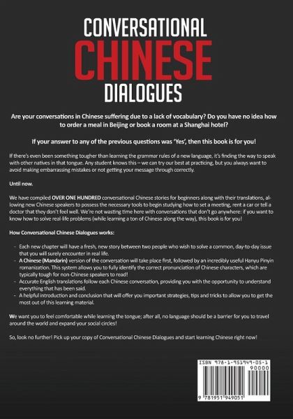 Are your conversations in Chinese suffering due to a lack of vocabulary? Do you have no idea how to order a meal in Beijing or book a room at a Shanghai hotel? If your answer to any of the previous questions was ‘Yes’, then this book is for you! If there’s even been something tougher than learning the grammar rules of a new language, it’s finding the way to speak with other natives in that tongue. Any student knows this – we can try our best at practicing, but you always want to avoid making embarrassing mistakes or not getting your message through correctly. Until now. We have compiled OVER ONE HUNDRED conversational Chinese stories for beginners along with their translations, allowing new Chinese speakers to possess the necessary tools to begin studying how to set a meeting, rent a car or tell a doctor that they don’t feel well. We’re not wasting time here with conversations that don’t go anywhere: if you want to know how to solve real-life problems (while learning a ton of Chinese along the way), this book is for you! How Conversational Chinese Dialogues works: Each new chapter will have a fresh, new story between two people who wish to solve a common, day-to-day issue that you will surely encounter in real life. A Chinese (Mandarin) version of the conversation will take place first, followed by an incredibly useful Hanyu Pinyin romanization. This system allows you to fully identify the correct pronunciation of Chinese characters, which are typically tough for non-Chinese speakers to read! Accurate English translations follow each Chinese conversation, providing you with the opportunity to understand everything that has been said. A helpful introduction and conclusion that will offer you important strategies, tips and tricks to allow you to get the most out of this learning material. We want you to feel comfortable while learning the tongue; after all, no language should be a barrier for you to travel around the world and expand your social circles! So, look no further! Pick up your copy of Conversational Chinese Dialogues and start learning Chinese right now!