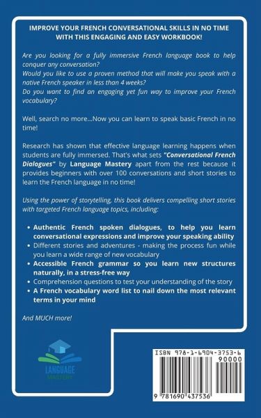 IMPROVE YOUR FRENCH CONVERSATIONAL SKILLS IN NO TIME WITH THIS ENGAGING AND EASY METHOD! Are you looking for a fully immersive French language book to help conquer any conversation? Would you like to use a proven method that will make you speak with a native French speaker in less than 4 weeks? Do you want to find an engaging yet fun way to improve your French vocabulary? Well, search no more...Now you can learn to speak basic French in no time! Research has shown that effective language learning happens when students are fully immersed. That's what sets "Conversational French Dialogues" by Language Mastery apart from the rest because it provides beginners with over 100 conversations and short stories to learn the French language in no time! Using the power of storytelling, this book delivers compelling short stories with targeted French language topics, including: Authentic French spoken dialogues, to help you learn conversational expressions and improve your speaking ability Different stories and adventures - making the process fun while you learn a wide range of new vocabulary Accessible French grammar so you learn new structures naturally, in a stress-free way Comprehension questions to test your understanding of the story A French vocabulary word list to nail down the most relevant terms in your mind And MUCH more! You don't have to struggle when it comes to learn a second language like French! Make it a breeze with "Conversational French Dialogues"! SCROLL UP, GET THE BOOK, AND START SPEAKING FRENCH IN NO TIME!