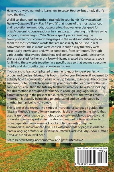 THIS BOOK DOESN'T CONTAIN ANY WORDS IN THE HEBREW ALPHABET! ALL HEBREW WORDS, IN BOTH THE KINDLE AND PAPERBACK VERSION OF THIS BOOK, WERE WRITTEN IN ENGLISH-TRANSLITERATION! Have you always wanted to learn how to speak Hebrew but simply didn't have the time? Well if so, then, look no further. You can hold in your hands "Conversational Hebrew Quick and Easy - Books I, II and III" that is one of the most advanced and revolutionary methods, boxset series, that was ever designed for quickly becoming conversational in a language. In creating this time-saving program, master linguist Yatir Nitzany spent years examining the twenty-seven most common languages in the world and distilling from them the most common words that are most likely to be used in real conversations. These words were chosen in such a way that they were structurally interrelated and, when combined, form sentences. Through various other discoveries about how real conversations work--discoveries that are detailed further in this book--Nitzany created the necessary tools for linking these words together in a specific way so that you may become rapidly and almost effortlessly conversant--now. If you want to learn complicated grammar rules, or to speak perfectly proper and precise Hebrew, this book is not for you. However, if you need to actually hold a conversation while on a trip to Israel, to impress that certain someone, or to be able to speak with your grandfather or grandmother as soon as possible, then the Nitzany Method is what you have been looking for. This method is designed for fluency in a foreign language, while communicating in the present tense. Nitzany believes that what's most important is actually being able to understand and be understood by another human being right away. This is one of the several, in a series of instructional language guides, the Nitzany Method's revolutionary approach is the only one in the world that uses its unique language technology to actually enable you to speak and understand native speakers in the shortest amount of time possible. No more depending on volumes of books of fundamental, beginner, intermediate, and advanced levels, all with hundreds of pages in order to learn a language. With "Conversational Hebrew Quick and Easy - Series - Books I, II and III", are all you will need. Learn Hebrew today, not tomorrow, and get started now!