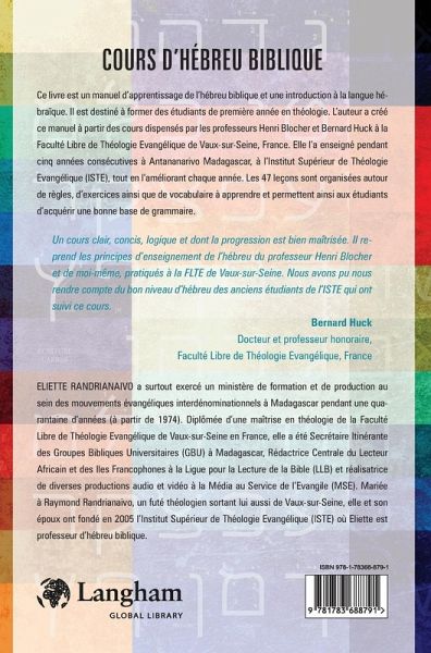 Ce livre est destiné à former des étudiants de première année en théologie. L'auteur a créé ce manuel à partir des cours dispensés par les professeurs Henri Blocher et Bernard Huck. Elle l'a enseigné pendant cinq années consécutives à Antananarivo Madagascar, à l'Institut Supérieur de Théologie Evangélique (ISTE). Les 47 leçons sont organisées autour de règles, d'exercices ainsi que de vocabulaire à apprendre et permettent ainsi aux étudiants d'acquérir une bonne base de grammaire.