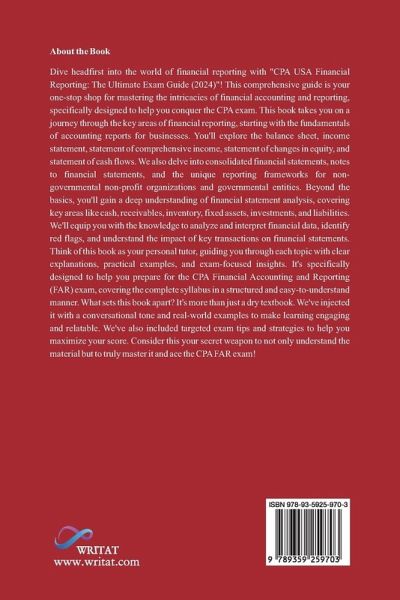 Dive headfirst into the world of financial reporting with "CPA USA Financial Reporting: The Ultimate Exam Guide (2024)"! This comprehensive guide is your one-stop shop for mastering the intricacies of financial accounting and reporting, specifically designed to help you conquer the CPA exam. This book takes you on a journey through the key areas of financial reporting, starting with the fundamentals of accounting reports for businesses. You'll explore the balance sheet, income statement, statement of comprehensive income, statement of changes in equity, and statement of cash flows. We also delve into consolidated financial statements, notes to financial statements, and the unique reporting frameworks for non-governmental non-profit organizations and governmental entities. Beyond the basics, you'll gain a deep understanding of financial statement analysis, covering key areas like cash, receivables, inventory, fixed assets, investments, and liabilities. We'll equip you with the knowledge to analyze and interpret financial data, identify red flags, and understand the impact of key transactions on financial statements. Think of this book as your personal tutor, guiding you through each topic with clear explanations, practical examples, and exam-focused insights. It's specifically designed to help you prepare for the CPA Financial Accounting and Reporting (FAR) exam, covering the complete syllabus in a structured and easy-to-understand manner. What sets this book apart? It's more than just a dry textbook. We've injected it with a conversational tone and real-world examples to make learning engaging and relatable. We've also included targeted exam tips and strategies to help you maximize your score. Consider this your secret weapon to not only understand the material but to truly master it and ace the CPA FAR exam!