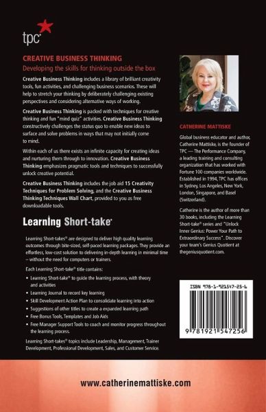 Creative Business Thinking: Developing the Skills for Thinking Outside the BoxCreative Business Thinking includes a library of brilliant creativity tools, fun activities, and challenging business scenarios. These will help to stretch your thinking by deliberately challenging existing perspectives and considering alternative ways of working.Creative Business Thinking is packed with techniques for creative thinking and fun "mind quiz" activities. Creative Business Thinking constructively challenges the status quo to enable new ideas to surface and solve problems in ways that may not initially come to mind.Within each of us there exists an infinite capacity for creating ideas and nurturing them through to innovation. Creative Business Thinking emphasizes pragmatic tools and techniques to successfully unlock creative potential.Creative Business Thinking includes the job aid 15 Creativity Techniques for Problem Solving, and the Creative Business Thinking Techniques Wall Chart, provided to you as free downloadable tools.