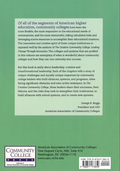 Turning adversity into opportunity, overcoming obstacles, building alliances, systems, and programs that lead to success-each chapter of this popular publication tells a unique story about the distinct challenges community colleges face. It also details the unique responses of community college leaders with the vision to overcome the challenges and the resistance. Take this opportunity to explore how creative and transformational leadership can turn adversity into success. Community college leaders share their real-world experiences including the successes, failures, and risks that led to strengthened institutions, more successful alliances, and the creation of new systems. But this book is really about leadership: creative and transformational leadership. Each of the chapters tells a story of unique challenges and equally unique responses by community college leaders who built alliances, systems, and programs, often facing significant obstacles and even active resistance. In The Creative Community College, these leaders share their success, their failures, and the risks they took to strengthen their institutions, to build alliances with school systems, and to create new systems. George R. Boggs, former CEO and President, American Association of Community Colleges