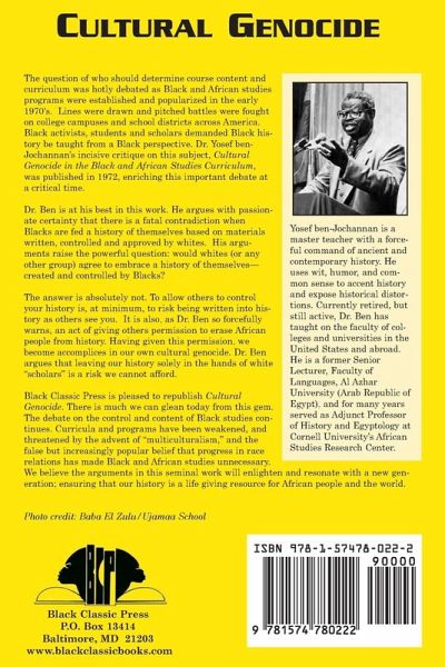 As Black and African Studies programs emerged in the early 1970's, the question of who has the right and responsibility to determine course content and curriculum also emerged. In 1972, Dr. Ben's critique on this subject was published as Cultural Genocide in The Black and African Studies Curriculum. It has been republished several times since then and its topic has remained timely and unresolved.