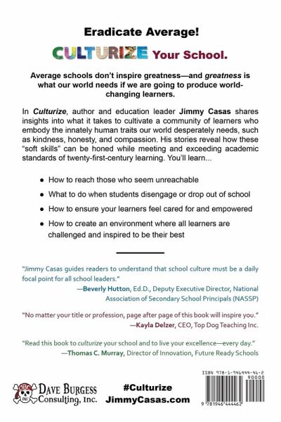 Eradicate Average! CULTURIZE Your School. Average schools don't inspire greatness-and greatness is what our world needs if we are going to produce world-changing learners. In Culturize, author and education leader Jimmy Casas shares insights into what it takes to cultivate a community of learners who embody the innately human traits our world desperately needs, such as kindness, honesty, and compassion. His stories reveal how these "soft skills" can be honed while meeting and exceeding academic standards of twenty-first-century learning. You'll learn... How to reach those who seem unreachable What to do when students disengage or drop out of school How to ensure your learners feel cared for and empowered How to create an environment where all learners are challenged and inspired to be their best ______ "Jimmy Casas guides readers to understand that school culture must be a daily focal point for all school leaders." -Beverly Hutton, Ed.D., Deputy Executive Director, National Association of Secondary School Principals (NASSP) "No matter your title or profession, page after page of this book will inspire you." -Kayla Delzer, CEO, Top Dog Teaching Inc. "Read this book to culturize your school and to live your excellence-every day." -Thomas C. Murray, Director of Innovation, Future Ready Schools