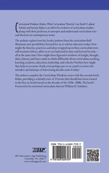 Curriculum Windows Redux: What Curriculum Theorists Can Teach Us about Schools and Society Today is an effort by students of curriculum studies, along with their professor, to interpret and understand curriculum texts and theorists in contemporary terms. The authors explore how key books/authors from the curriculum field illuminate new possibilities forward for us as scholar educators today: How might the theories, practices, and ideas wrapped up in these curriculum texts still resonate with us, allow us to see backward in time and forward in time - all at the same time? How might these figurative windows of insight, thought, ideas, fantasy, and fancy make us think differently about curriculum, teaching, learning, students, education, leadership, and schools? Further, how might they help us see more clearly, even perhaps put us on a path to correct the mistakes and missteps of intervening decades and of today? The authors complete the Curriculum Windows series with this 7th book, Redux, providing a scholarly view of 33 books that should have been treated in the first 6 books based on the decades of the 1950s-2000s. The book's Foreword is by renowned curriculum theorist William H. Schubert.