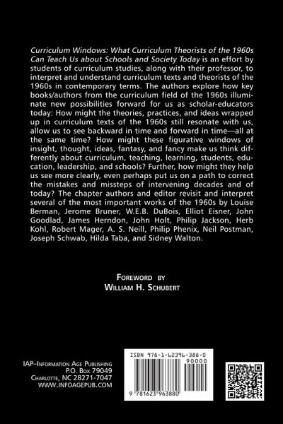 Curriculum Windows: What Curriculum Theorists of the 1960s Can Teach Us about Schools and Society Today is an effort by students of curriculum studies, along with their professor, to interpret and understand curriculum texts and theorists of the 1960s in contemporary terms. The authors explore how key books/ authors from the curriculum field of the 1960s illuminate new possibilities forward for us as scholareducators today: How might the theories, practices, and ideas wrapped up in curriculum texts of the 1960s still resonate with us, allow us to see backward in time and forward in time - all at the same time? How might these figurative windows of insight, thought, ideas, fantasy, and fancy make us think differently about curriculum, teaching, learning, students, education, leadership, and schools? Further, how might they help us see more clearly, even perhaps put us on a path to correct the mistakes and missteps of intervening decades and of today? The chapter authors and editor revisit and interpret several of the most important works of the 1960s by Louise Berman, Jerome Bruner, WEB DuBois, Eliot Eisner, John Goodlad, James Herndon, John Holt, Philip Jackson, Herb Kohl, Robert Mager, A.S. Neill, Philip Phenix, Neil Postman. Joseph Schwab, Hilda Taba, and Sidney Walton. The book's Foreword is by renowned curriculum theorist William H. Schubert.