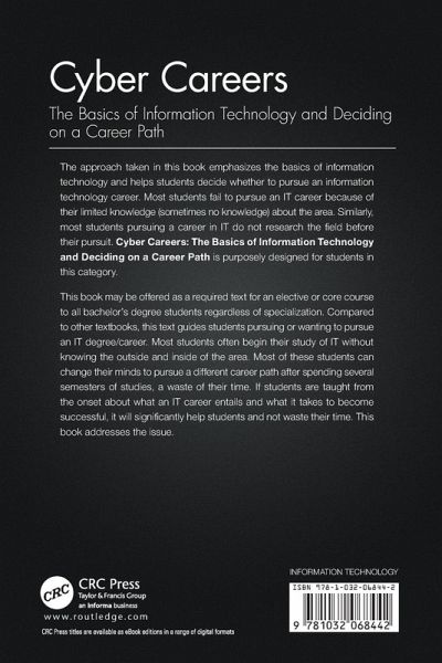 The approach taken in this book emphasizes the basics of information technology and helps students decide whether to pursue an information technology career. Most students fail to pursue an IT career because of their limited knowledge (sometimes no knowledge) about the area. Similarly, most students pursuing a career in IT do not research the field before their pursuit. This book is purposely designed for students in this category. The book may be offered as a required text for an elective or core course to all bachelor's degree students regardless of specialization. Compared to other textbooks, this text guides students pursuing or wanting to pursue an IT degree/career. Most students often begin their study of IT without knowing the outside and inside of the area. Most of these students can change their minds to pursue a different career path after spending several semesters of studies, a waste of their time. If students are taught from the onset about what an IT career entails and what it takes to become successful, it will significantly help students and not waste their time. This book addresses the issue.