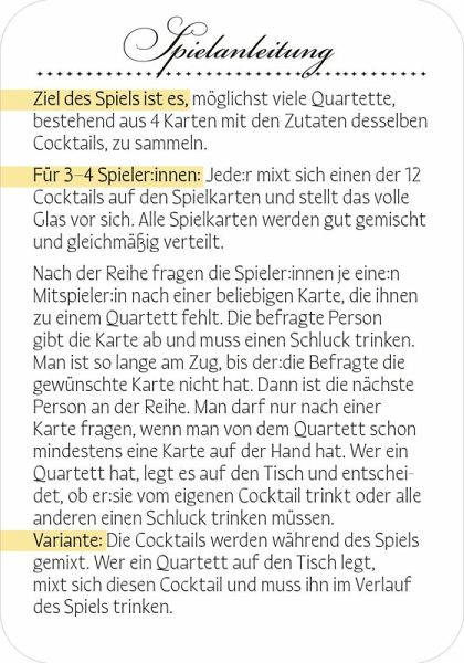 Mit dem Cocktail-Quartett wird jede Party zum Erfolg! Fordere deine Freund:innen heraus, sammle Zutaten für Cocktails und genieße ein lustiges Spiel mit stilvollen Drinks.Ein Must-have für alle, die ihre Partys unvergesslich machen wollen!