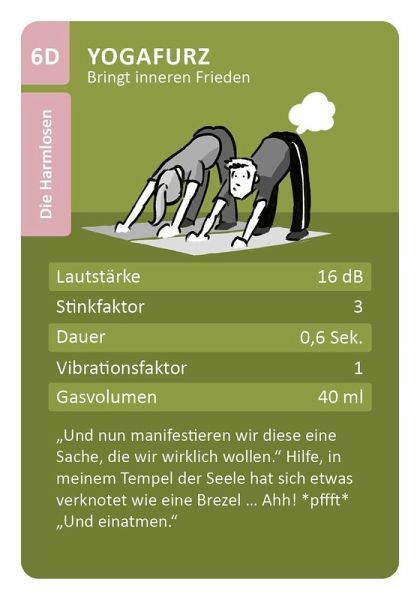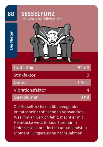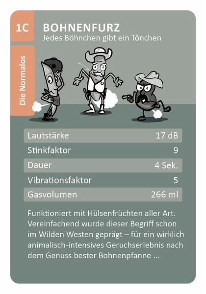 Vom stinknormalen Lüftchen über den mystischen Geisterfurz bis hin zum majestätischen Sesselfurz: Mit 32 atemberaubenden Furzarten ist dieses liebevoll illustrierte Quartett mit gewitzten Texten ein echtes Highlight für jeden Spieleabend in der Familie und unter Freunden.