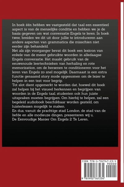 In boek één hebben we vastgesteld dat taal een essentieel aspect is van de menselijke conditie en hebben we je de basis gegeven om wat conversatie Engels te leren. In boek twee, breiden we dit uit door jullie te introduceren aan andere aspecten van grammatica die misschien niet eerder zijn behandeld. Tot slot dient opgemerkt te worden dat, hoewel dit boek zal helpen bij het visueel herkennen en begrijpen van woorden in de Engels taal, studenten ook hun juiste uitspraken moeten begrijpen. Om hierbij te helpen, zal een begeleid audioboek beschikbaar worden gesteld, om luisterlessen mogelijk te maken.En dus, vanuit de prachtige stad London, de stad van de liefde en alle modieuze dingen, presenteren wij u, De Eenvoudige Manier Om Engels 2 Te Leren.