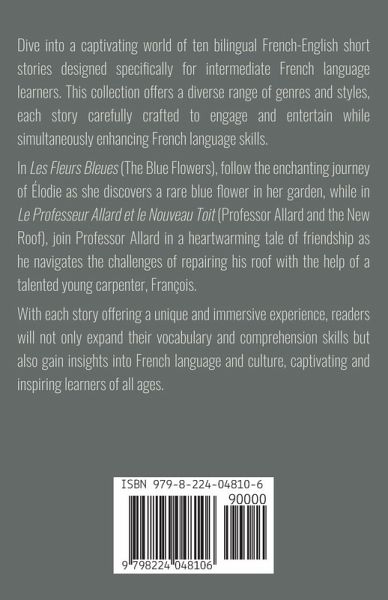 Dive into a captivating world of ten bilingual French-English short stories designed specifically for intermediate French language learners. This collection offers a diverse range of genres and styles, each story carefully crafted to engage and entertain while simultaneously enhancing French language skills. In Les Fleurs Bleues (The Blue Flowers), follow the enchanting journey of Élodie as she discovers a rare blue flower in her garden, while in Le Professeur Allard et le Nouveau Toit (Professor Allard and the New Roof), join Professor Allard in a heartwarming tale of friendship as he navigates the challenges of repairing his roof with the help of a talented young carpenter, François. With each story offering a unique and immersive experience, readers will not only expand their vocabulary and comprehension skills but also gain insights into French language and culture, captivating and inspiring learners of all ages.