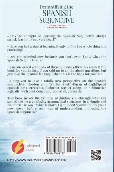 We, Gordon and Cynthia of LightSpeed Spanish, are totally excited to bring you the book that really does demystify the Present and Past Spanish Subjunctive. Most students of the Spanish language shy away from this subject and it's no wonder! So many books on the market make it look complex and difficult to understand. Yet here at LightSpeed Spanish we have developed the perfect system to walk you through the entire range of the Spanish Subjunctive, step by step. This comprehensive book uses simple, easy to understand explanations that won't leave you mind boggled, while it guides you through the creation of over 600 Subjunctive sentences. By the time you've finished this learning journey we anticipate that you will be more confident, more at ease and far more able to use the Spanish Subjunctive in every facet of your communication. It really is a must buy for any serious student of the Spanish language!