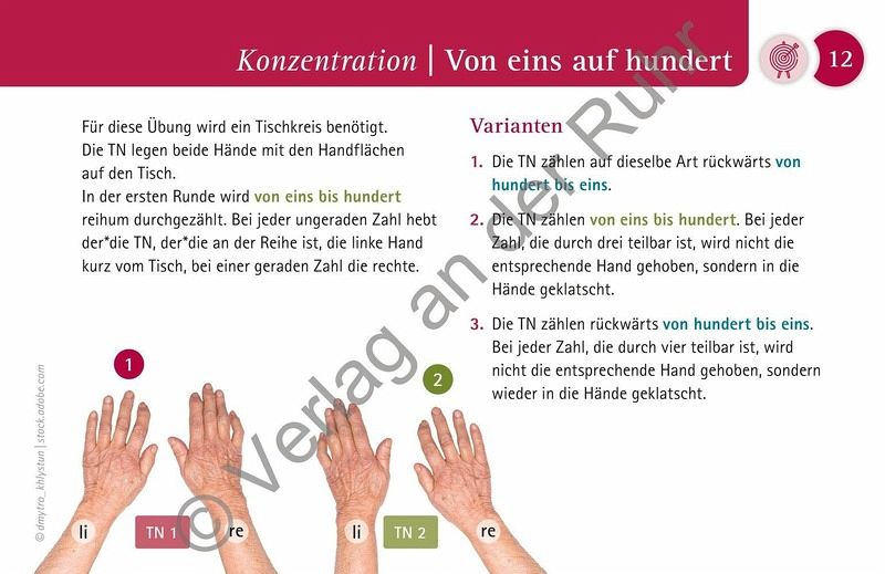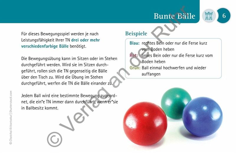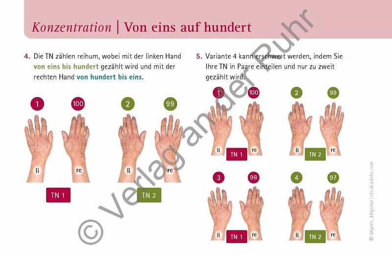 +++Fachkräfte in Altenpflege, Demenzbetreuung und Seniorenarbeit+++Mehr Erfolg durch ganzheitliches GedächtnistrainingMit diesem Kartenset gelingt die geistige und motorische Aktivierung von Senioren und Seniorinnen mit und ohne Demenz ohne große Vorbereitung. Ob dreierlei Händetanz, Rechnen mit Überkreuzbewegungen oder Zahlenspiele mit dem Ball - die Bewegungsspiele im Sitzen, Stehen oder in der freien Natur ermöglichen ein ganzheitliches Gedächtnistraining, fördern die Freude an der Bewegung und stärken das Selbstbewusstsein der Teilnehmenden.Praktischer Kartenfächer für die unkomplizierte AnwendungOb 10-Minuten-Aktivierung in der Einzelbetreuung oder Gedächtnistrainingsstunden in der Gruppe, die Übungen können einfach und unkompliziert an das Leistungsniveau der Senioren und Seniorinnen oder die Gruppengröße angepasst werden. Der praktische Kartenfächer mit Schraube ermöglicht das Entnehmen einzelner Karten, die so individuell zu einem Programm zusammengestellt werden können. Zusätzliche Unterstützung bieten die farbig gekennzeichneten Trainingsziele und die ausführlichen Tipps und Hinweise des Begleithefts. Für die optimale Gestaltung Ihrer Trainingseinheiten ohne aufwändige Vorbereitung.
