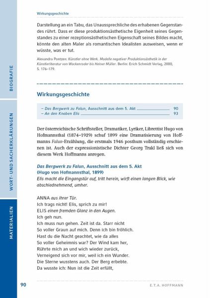 In E.T.A. Hoffmanns Die Bergwerke zu Falun wird der junge Seemann Elis von einer mystischen Sehnsucht nach der Tiefe und der Bergwelt ergriffen, entfremdet sich zunehmend vom realen Leben und findet schließlich am Tag seiner Hochzeit im Berg den Tod.