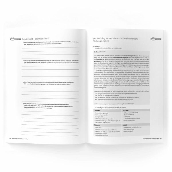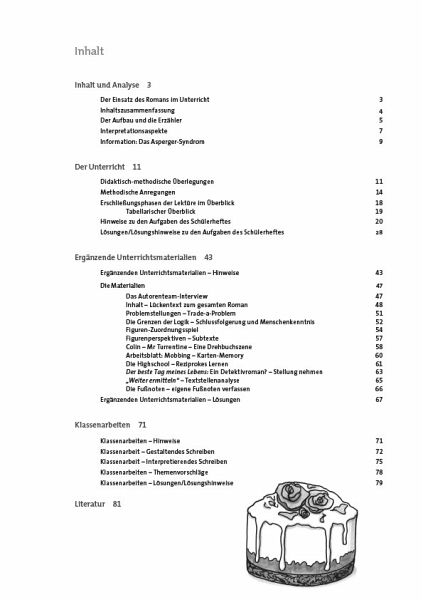 Einsatz des Romans im Unterricht Inhaltszusammenfassung & Interpretationsaspekte Aufbau und Erzähler Informationen zum Asperger-Syndrom Didaktisch-methodische Überlegungen Erschließung der Lektüre im Überblick Hinweise zum Schülerheft Interview mit den Autoren formulieren Lückentext zum Romaninhalt Figurenzuordnung und -perspektiven Drehbuchszene schreiben Mobbing - Karten-Memory Reziprokes Lernen: Die Highschool Ein Detektivroman? - Stellung nehmen Textstellenanalyse & Fußnoten verfassen Klassenarbeiten zum gestaltenden Schreiben und interpretierenden Schreiben mit Themenvorschlägen und Lösungshinweisen.