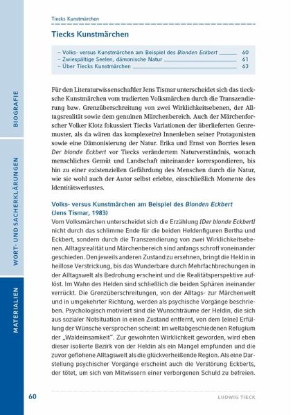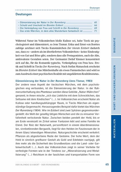 Es handelt sich um zwei Paradebeispiele für die Epoche der Frühromantik: Ludwig Tiecks Kunstmärchen "Der blonde Eckbert" (1797) und "Der Runenberg" (1804). Anders als in den Volksmärchen der Brüder Grimm findet der Held nicht sein Glück, sondern verfällt den eigenen Dämonen. Die Landschaft wird zum symbolischen Innenraum, die Grenzen von Traum und Wirklichkeit verschwimmen. Tiecks blonder Eckbert ist ein Zerrissener, von Verfolgungswahn Getriebener, der nach der Kindheitserzählung seiner Frau Bertha den eigenen Freund tötet und zunehmend dem Wahnsinn verfällt. Ein ähnliches Schicksal ereilt den Jäger Christian in "Der Runenberg". Er verlässt seine Familie, um einem Trugbild, einem alten Waldweib, nachzulaufen.