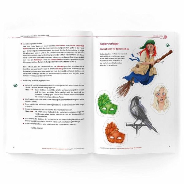 Schritt-für-Schritt-Bauanleitung für die individuelle Lesebox und den roten Faden Erinnerungskärtchen für alle Kapitel - zum Ausdrucken und kreativen Gestalten eine fertige Lesebox mit Stickerbogen zur Dekoration der Lesebox sowie ein Satz der Erinnerungskärtchen in A5 Format - für eine individuelle und bunte Gestaltung Bastelanleitungen für Abraxas, den treuen Raben - inklusive Kopf- und Schwanzdekorationen Zugang zum Downloadbereich mit Kopiervorlagen und Illustrationen zur Gestaltung der Lesebox