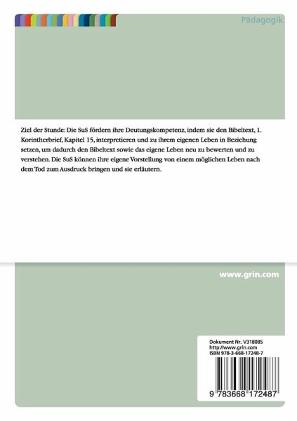Unterrichtsentwurf aus dem Jahr 2014 im Fachbereich Theologie - Religion als Schulfach, , Sprache: Deutsch, Abstract: Ziel der Stunde: Die SuS fördern ihre Deutungskompetenz, indem sie den Bibeltext, 1. Korintherbrief, Kapitel 15, interpretieren und zu ihrem eigenen Leben in Beziehung setzen, um dadurch den Bibeltext sowie das eigene Leben neu zu bewerten und zu verstehen. Die SuS können ihre eigene Vorstellung von einem möglichen Leben nach dem Tod zum Ausdruck bringen und sie erläutern.