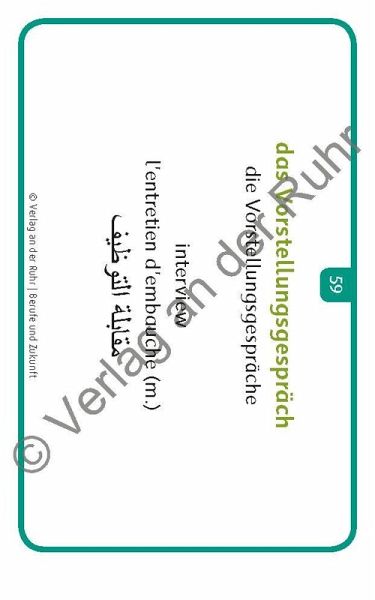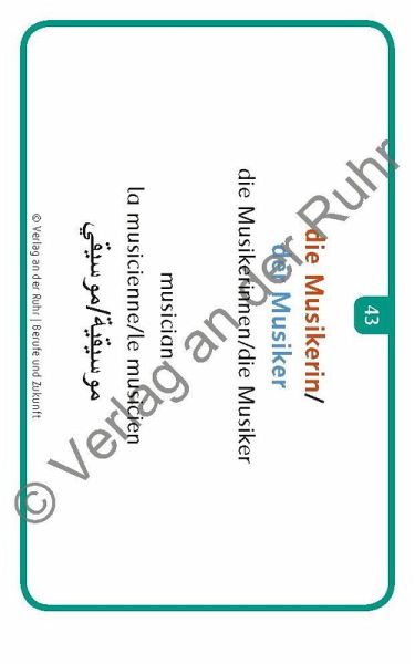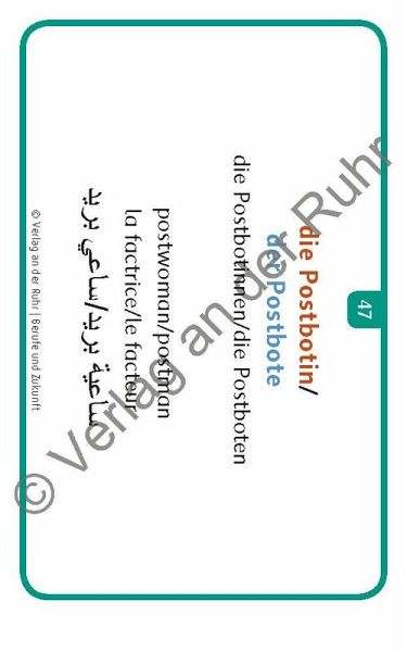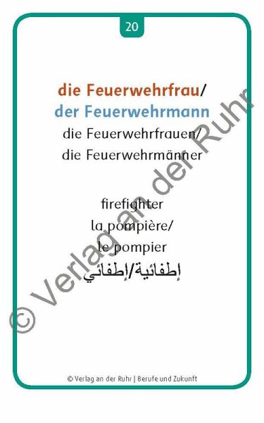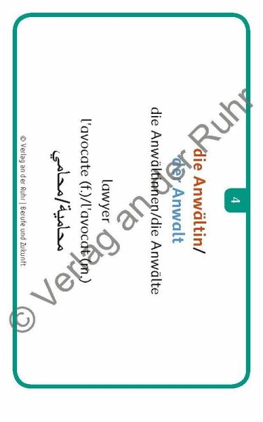 +++Bildkarten für Lehrer und Sprachförderkräfte an Schulen sowie für außerschulische Lehrkräfte, Fach: Sprachförderung, Deutsch als Zweitsprache (DaZ)/Deutsch als Fremdsprache (DaF). Für alle Altersstufen; ab Sprachniveau A1 +++ Herzlich willkommen! - Welcome! - Bienvenue! - Ahlaan wa sahlaan! Viele Menschen, die z. B. als Flüchtlinge nach Deutschland kommen, sind noch nie mit der deutschen Sprache in Berührung gekommen. Diese Migranten wollen die deutsche Sprache nun in der Regel so schnell wie möglich lernen. Egal ob Kinder oder Erwachsene, ob in der Schule, im VHS-Kurs, der Flüchtlingshilfe oder zu Hause: Mit diesen flexibel einsetzbaren Fotokarten können Sie Deutschlernern einfach und effektiv helfen. Das Set bietet 60 Vokabeln zu dem Themengebiet "Berufe und Zukunft", wie "die Bäckerin/der Bäcker" oder "der Arbeitsvertrag". Auf der Vorderseite ist jeweils ein Foto abgebildet, auf der Rückseite steht der dazugehörige deutsche Begriff im Singular und Plural mit Artikel. Die Berufsbezeichnungen werden sowohl in weiblicher als auch in männlicher Form angegeben und das jeweilige Genus ist farblich markiert. Zusätzlich wird der Begriff in drei weitere Sprachen übersetzt (Englisch, Französisch und Arabisch). Dadurch ergeben sich vielfältige Einsatzmöglichkeiten zum Sprechen und Zuhören. Kurze Anwendungstipps runden das Set ab. Ausführliche Ideen zu Übungen, Spielen u. v. m. finden Sie im zusätzlichen Download.